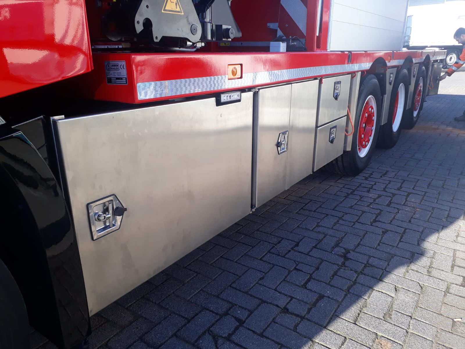 De laadvloer is voorzien van hardhout met 3 twistlocks platen per zijde. Met standaard zwevende bumper. Zijkanten voorzien van RVS gereedschapskisten.