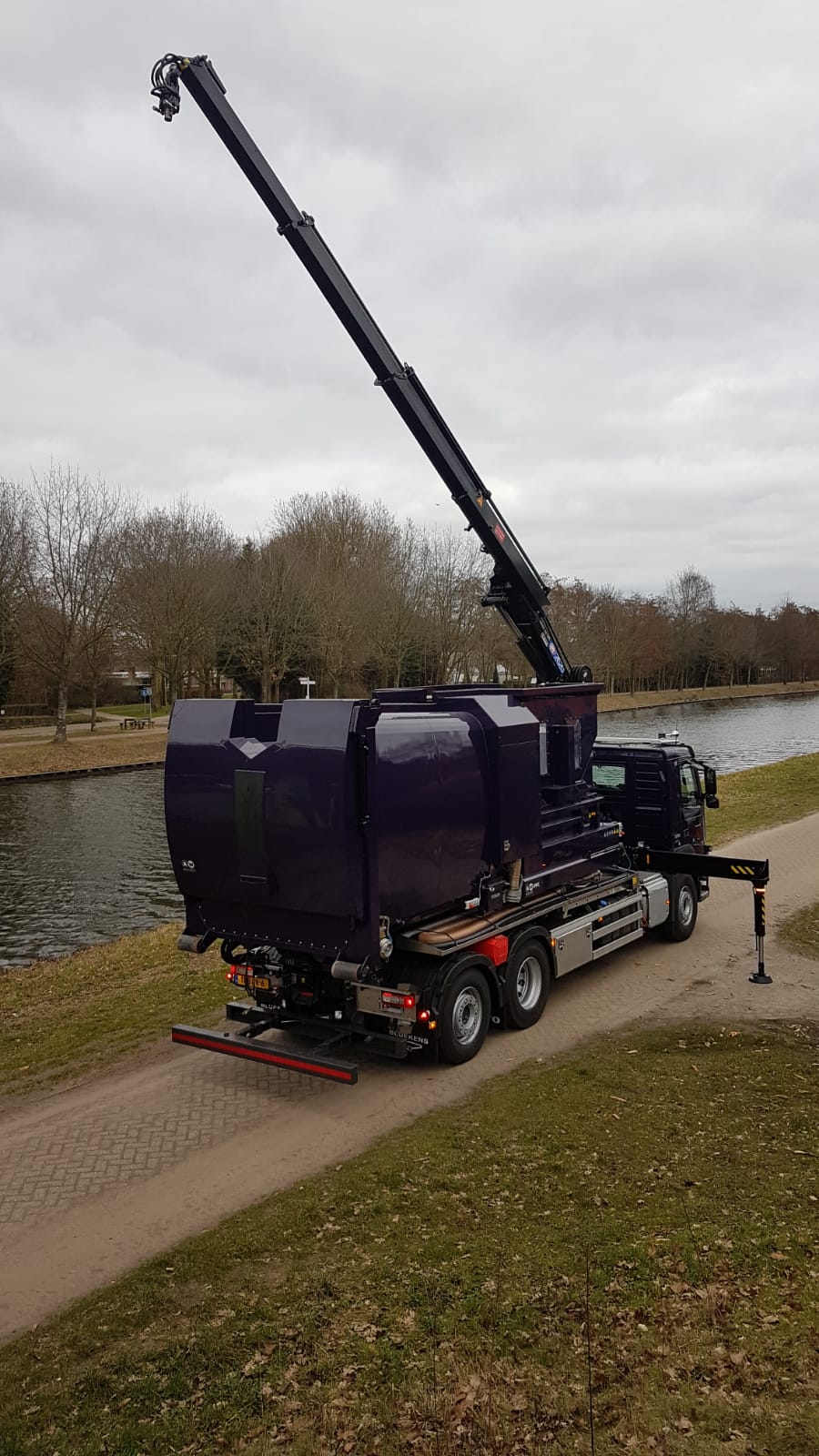HMF autolaadkraan met JHS haakarmsysteem en AW was- en zuigunit