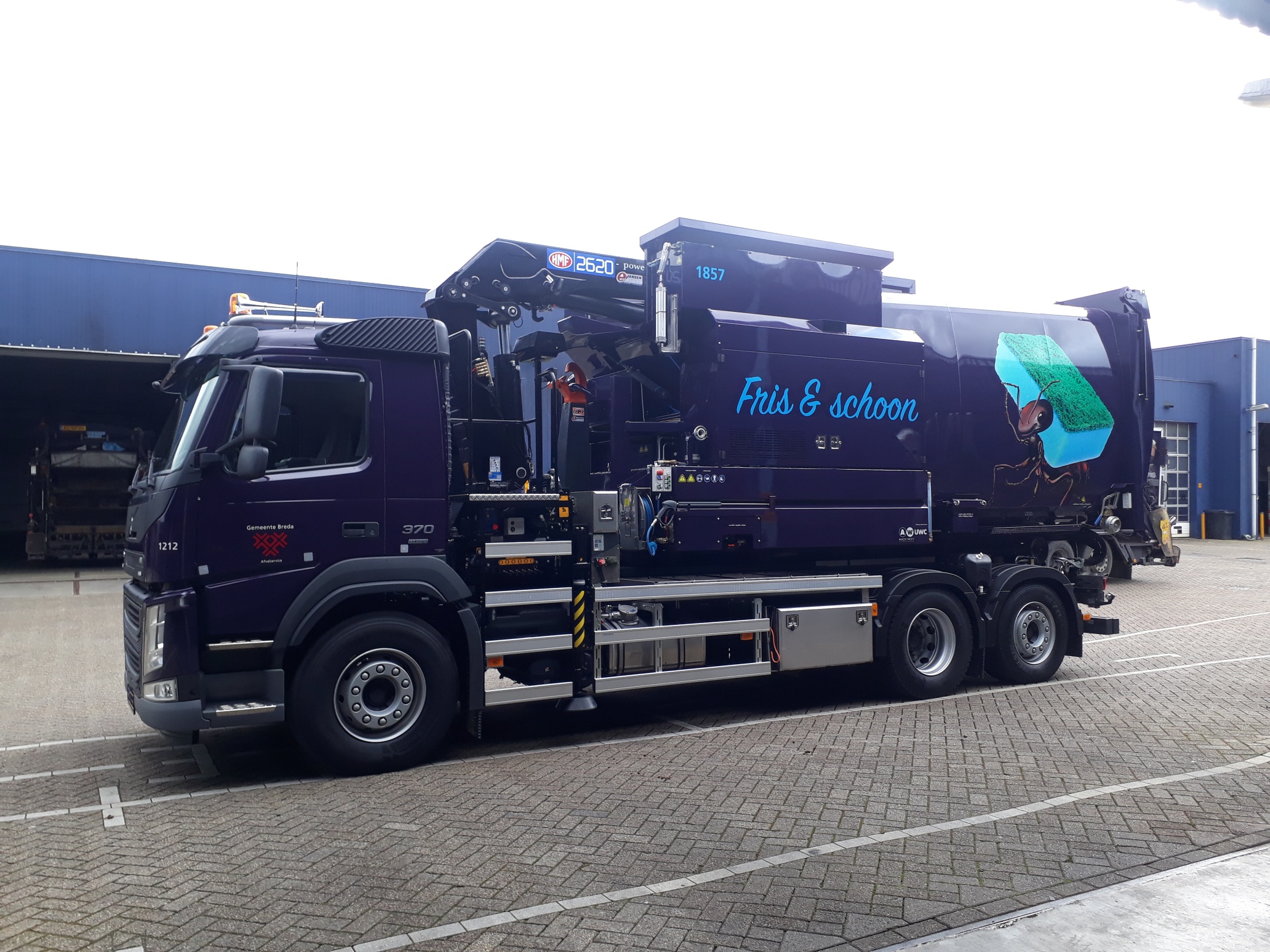 HMF autolaadkraan met een JHS haakarmsysteem en een AW was- en zuigunit voor Gemeente Breda