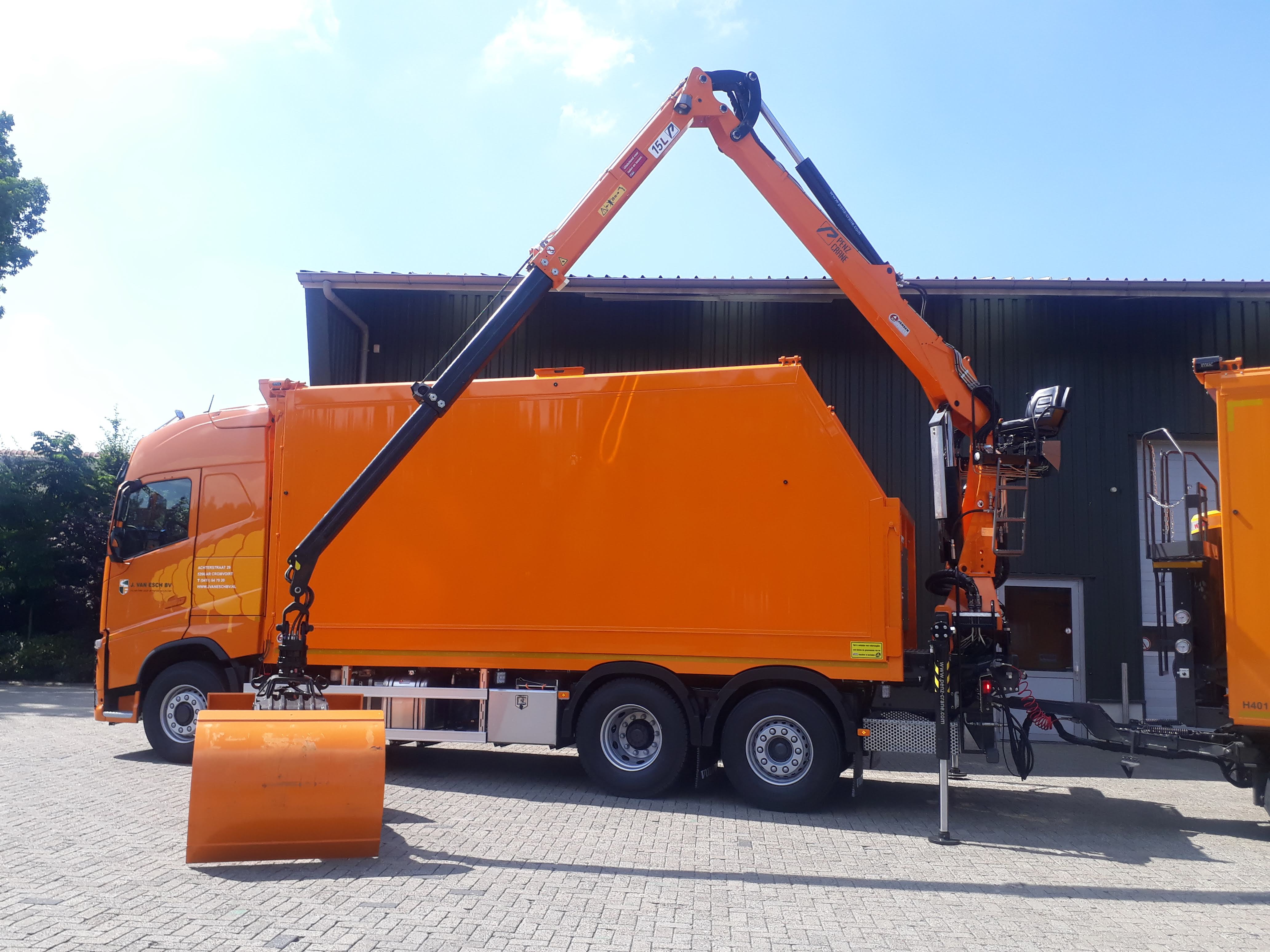 PENZ houtkraan met een JHS laadbak en een KEMPF aanhanger met aluminium kipperbak